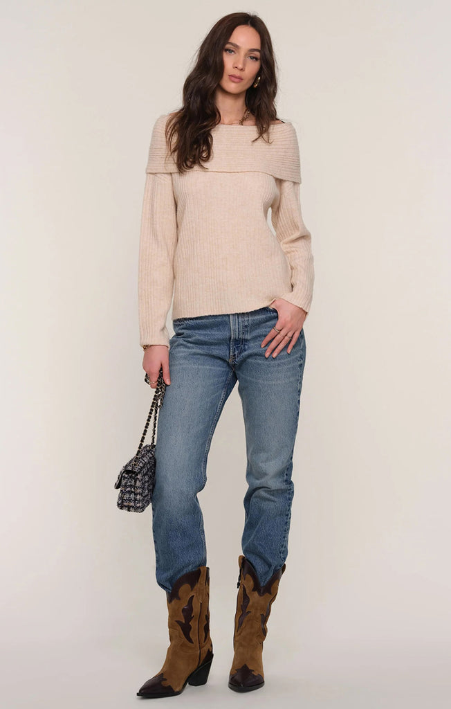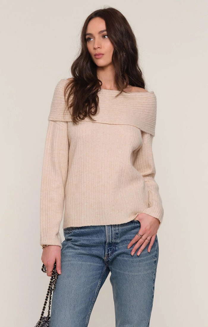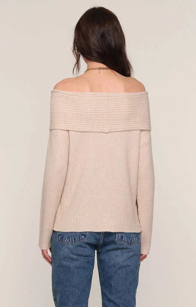 • The Kendra Sweater is a super-soft knit with a relaxed fit. It has a folded, off the shoulder neck. Its so comfortable, you'll want to wear it every day.
