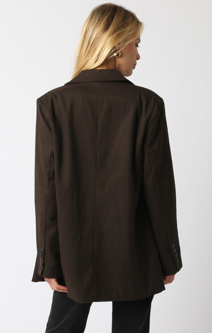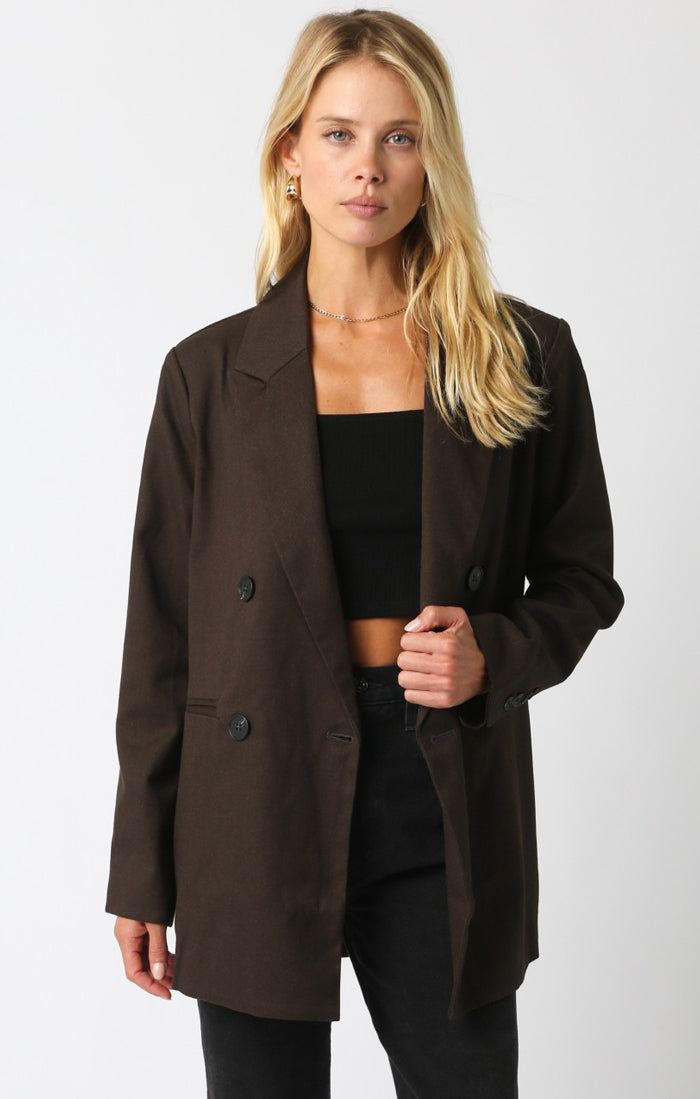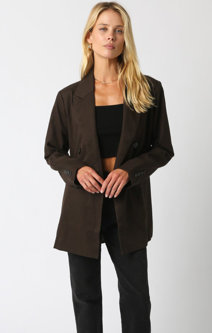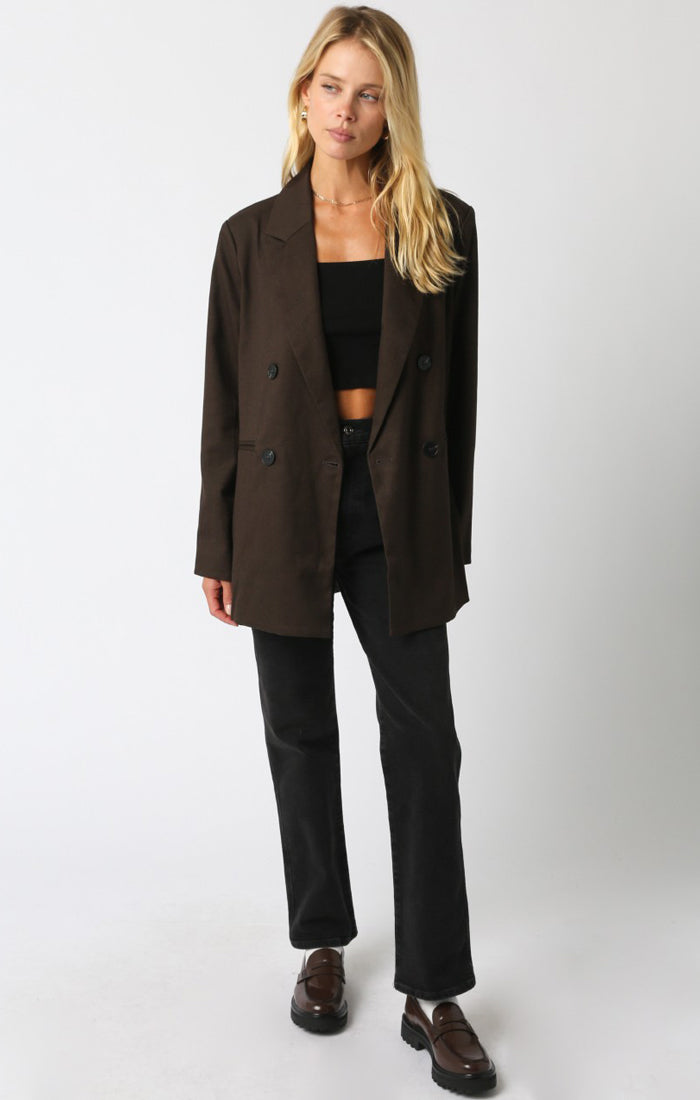 • An easygoing layer with just the right amount of polish. This chocolatey brown blazer was made for coffee dates that turn into cocktails. Relaxed in fit but sharp in vibe, it’s the kind of piece you can throw over denim, slip dresses, or that "I-didn’t-try-but-I-still-look-good" crop top. Double-breasted buttons seal the deal, but honestly… it looks just as good undone.