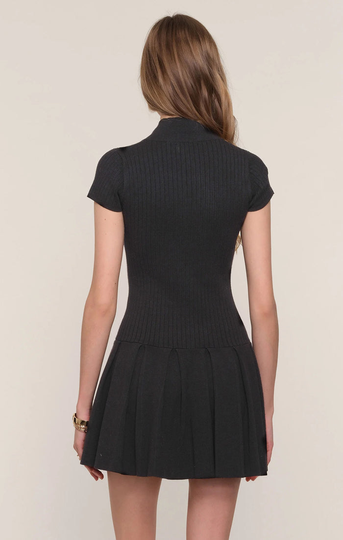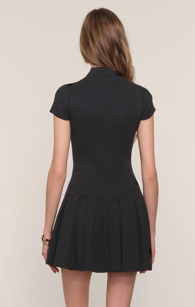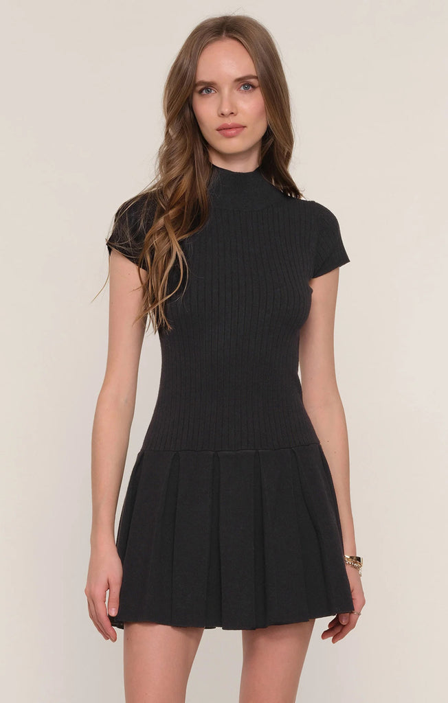 The Polina Dress is a slim fit, knit dress. It features a mock neck, cap sleeves and a pleated skirt. We love it worn with ballet flats and an oversized jacket.