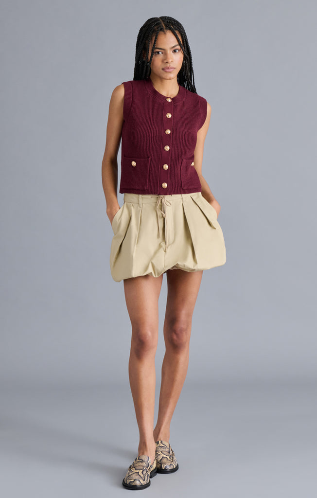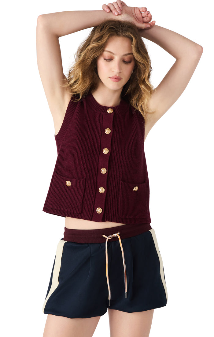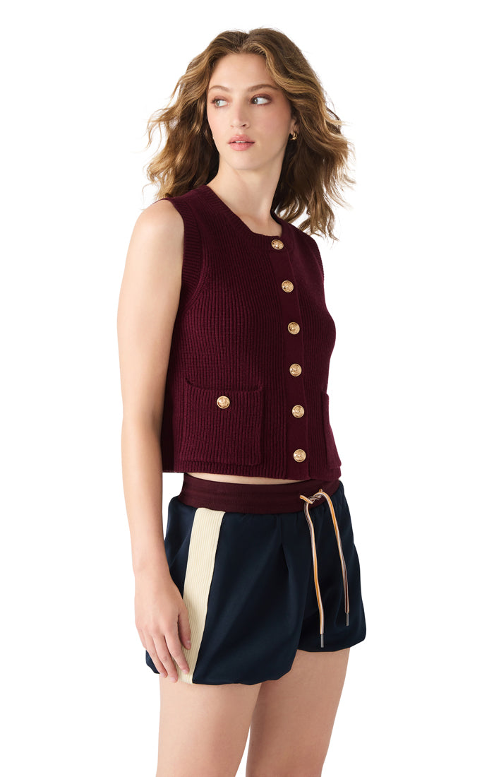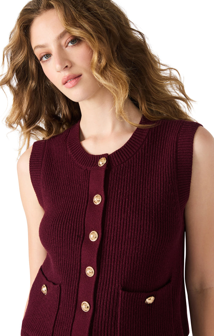 - Elevate your layering game with the Aliya Sweater Vest top This button-up, sleeveless design offers a refined silhouette perfect for transitional weather. Crafted for versatility, it pairs seamlessly with shirts or is worn alone for a polished, expert look.