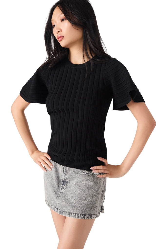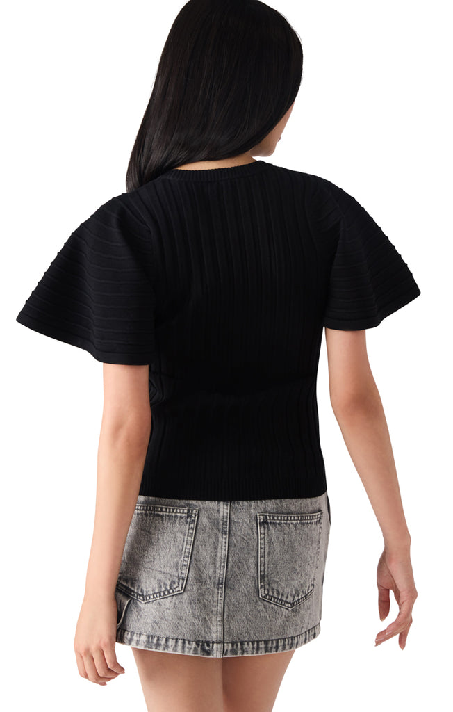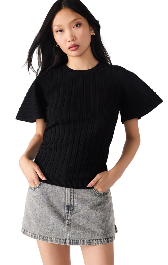 Sweet meets structured. The Allie Sweater pairs a sleek rib knit with soft, fluttery sleeves—proof that polished can still have a little play. Easy to style, impossible to ignore.