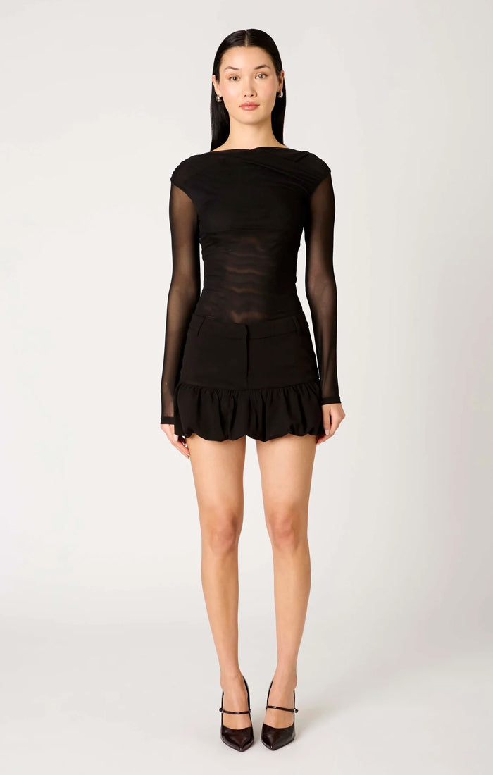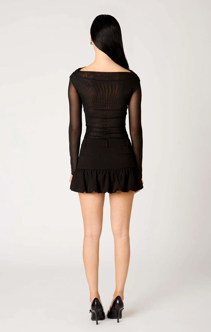 The Aria Top plays with contrast—sleek lines meet sheer texture in this lightweight mesh silhouette. Designed with a wide, slightly asymmetric bateau neckline, it highlights the collarbone while long fitted sleeves and a hip-length finish keep the look sharp. Semi-sheer with a second-skin feel, it layers easily or stands on its own for a subtle statement.