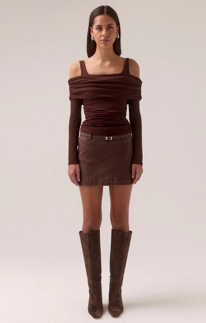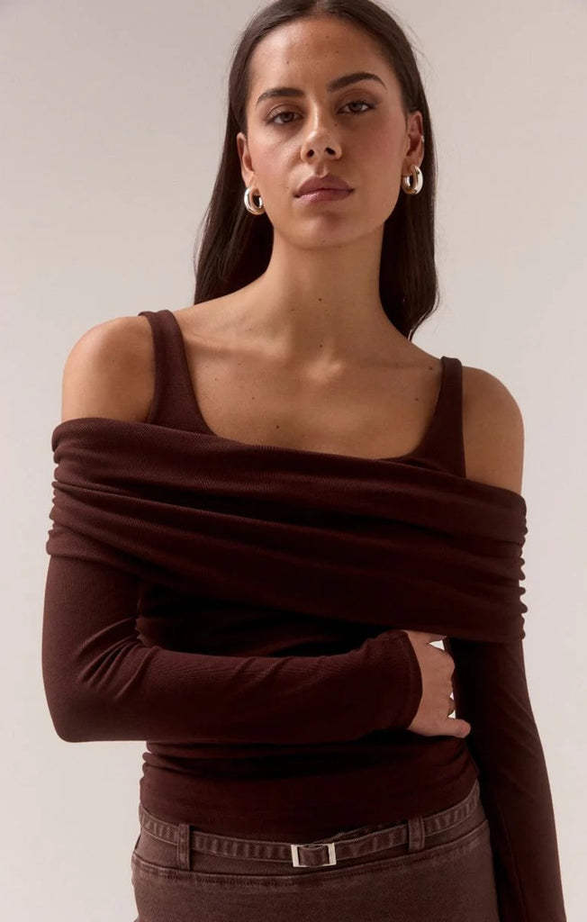 - The Elaian Long-Sleeve Top by Sovere Studios — soft, sculpted, and just a touch sultry. Designed in a silky stretch jersey with gathered details and an off-shoulder neckline, it’s the kind of top that makes “effortless” look planned. Pair it with denim or a sleek skirt — either way, it’s doing the most with minimal effort.