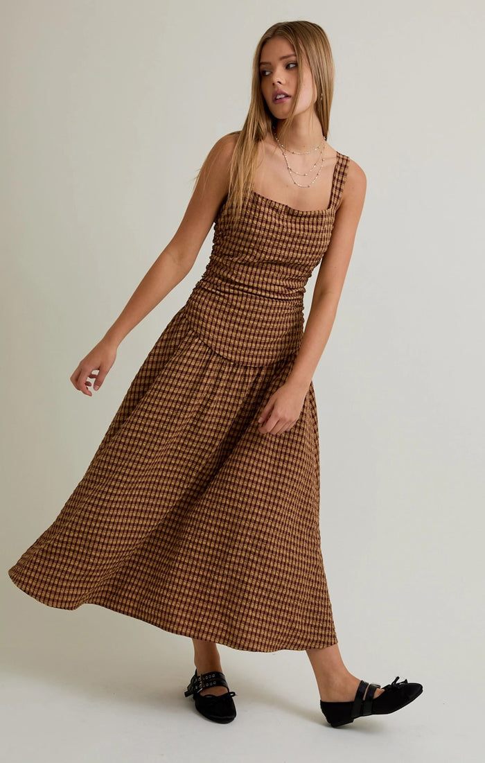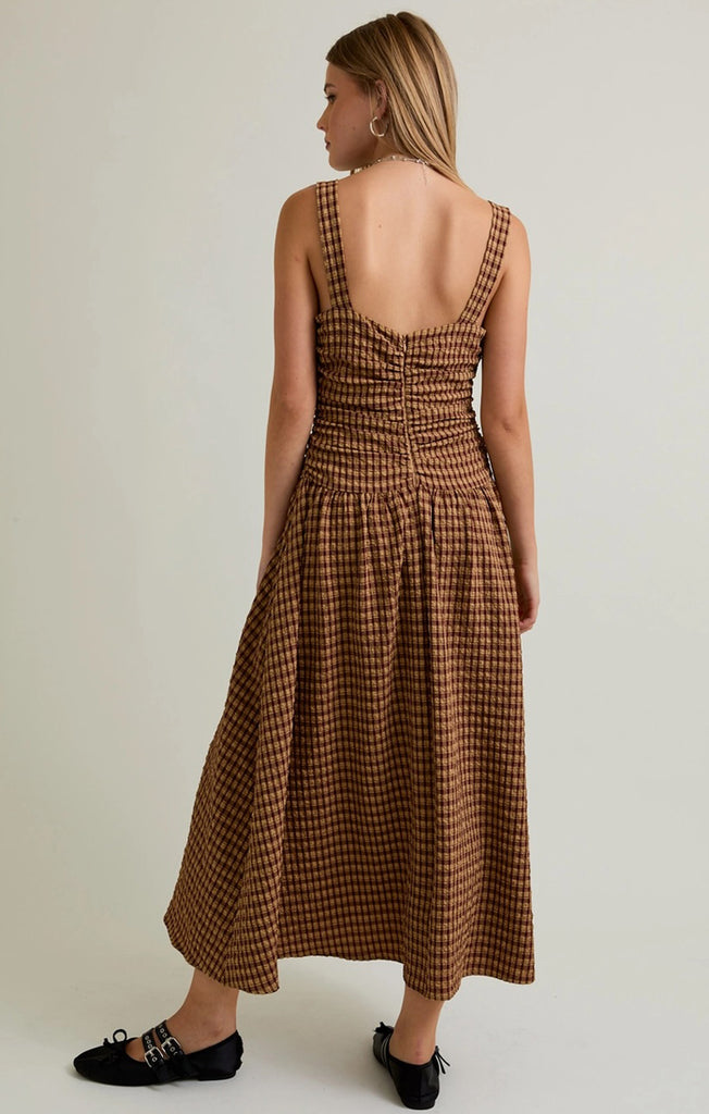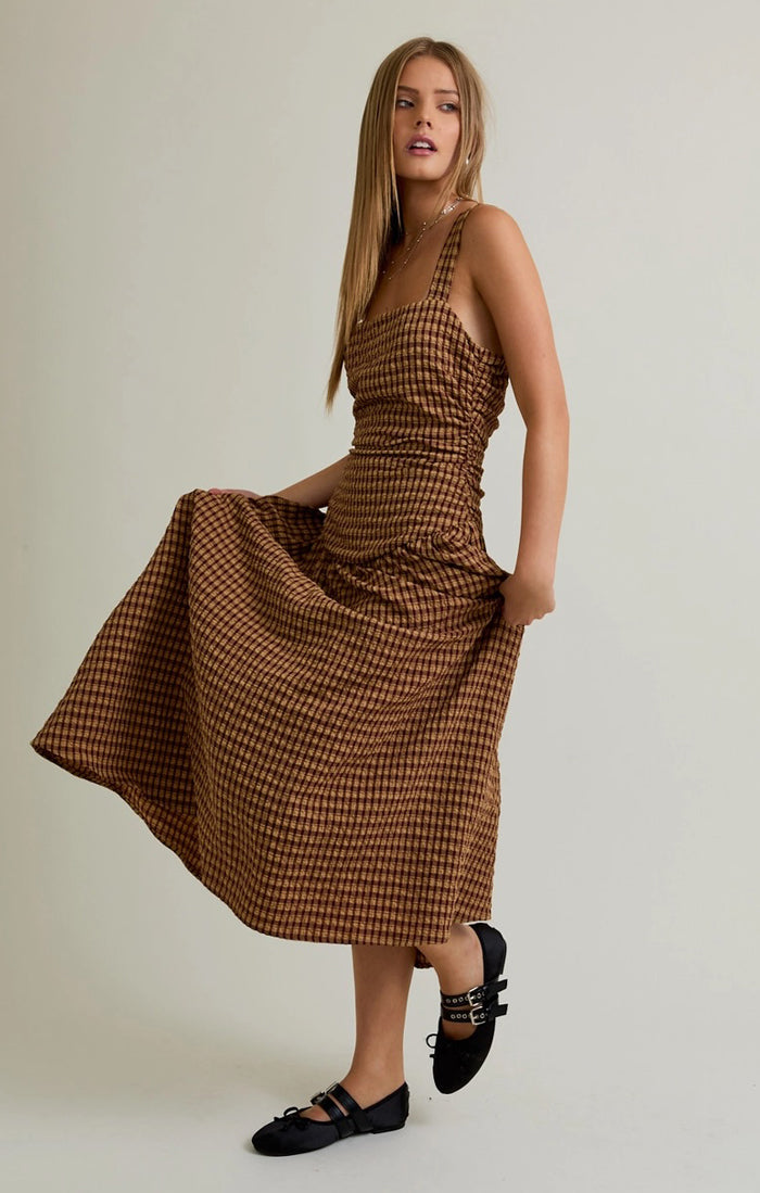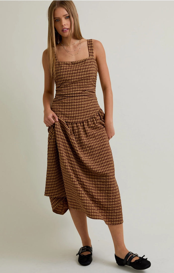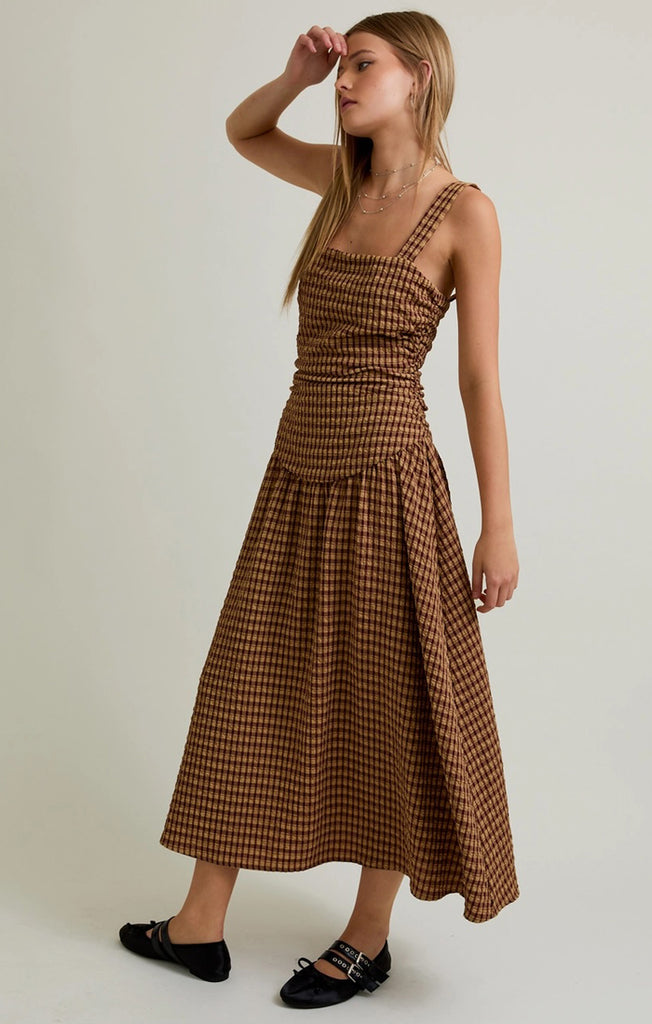 - Sweet, structured, and just a little nostalgic. This plaid midi from Le Lis pairs a square neckline with a dropped waist for that effortlessly undone, countryside-meets-city feel. The fit is flattering but never fussy — made for coffee runs, market strolls, and impromptu golden-hour plans. Pair with ballet flats now and boots later — she’s a year-round kind of love.