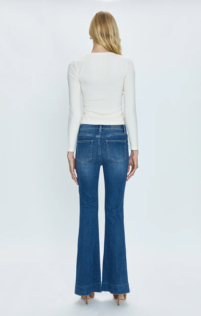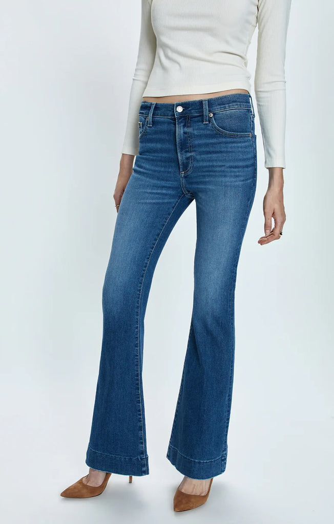 - The flare that brings the drama. Kinsley sits at a comfortable mid rise with an ultra flare silhouette and full-length 32 1/2" inseam that creates maximum movement and vintage-inspired proportions. The dramatic flare from knee to hem delivers retro sophistication with modern comfort. Crafted from stretch denim in Avenue, a classic medium indigo wash.