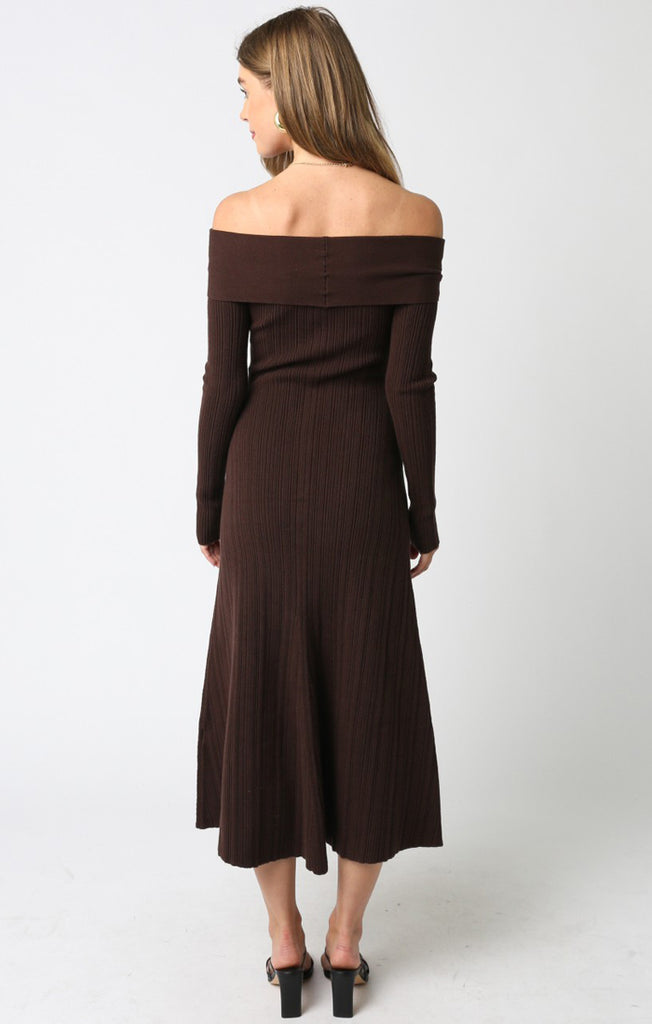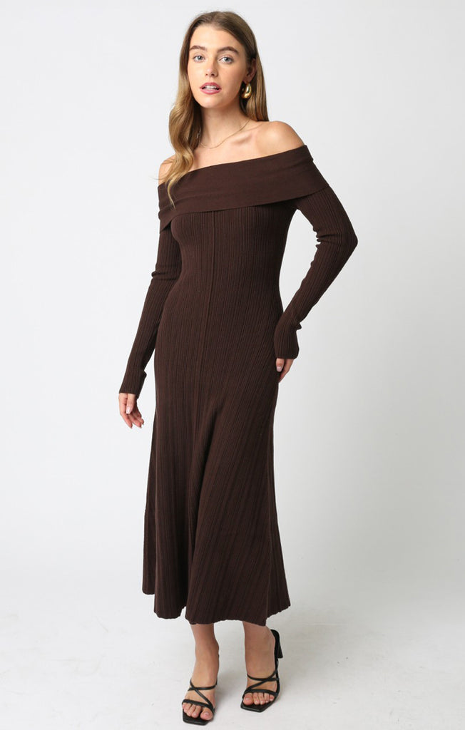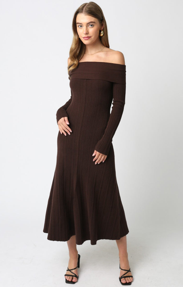 - The Anya Off Knit Dress from Olivaceous is your new favorite excuse to cancel plans and still look incredible doing it. Crafted in a rich brown hue, this off-the-shoulder number hugs just right with its cozy knit and long sleeves. Effortless, flattering, and a little flirty—basically everything you want in a fall dress.