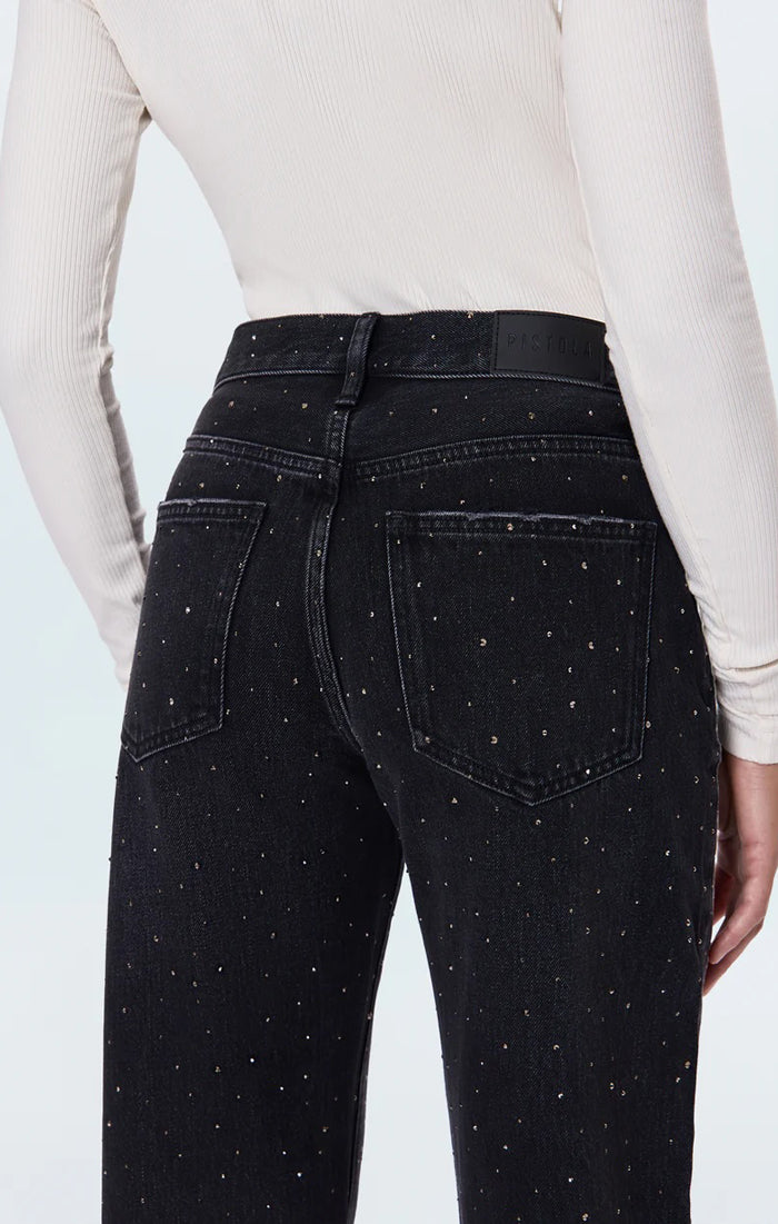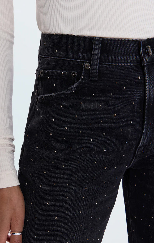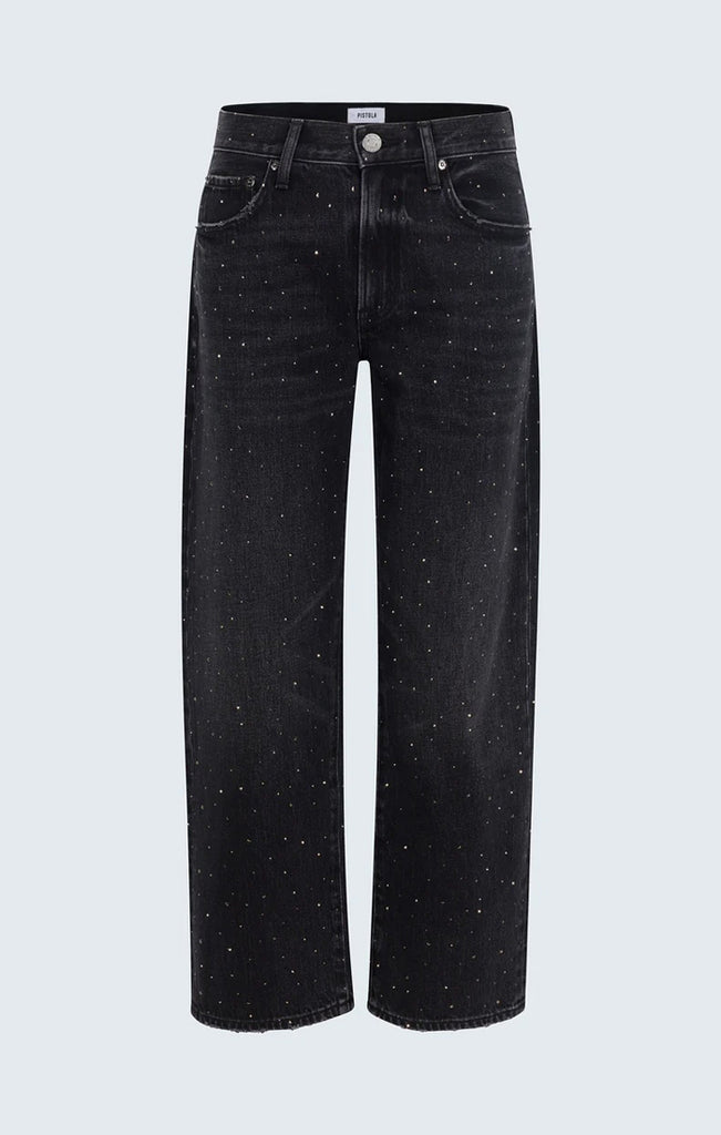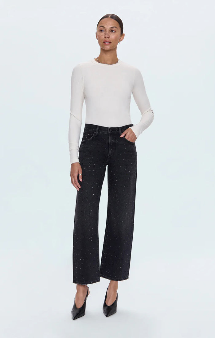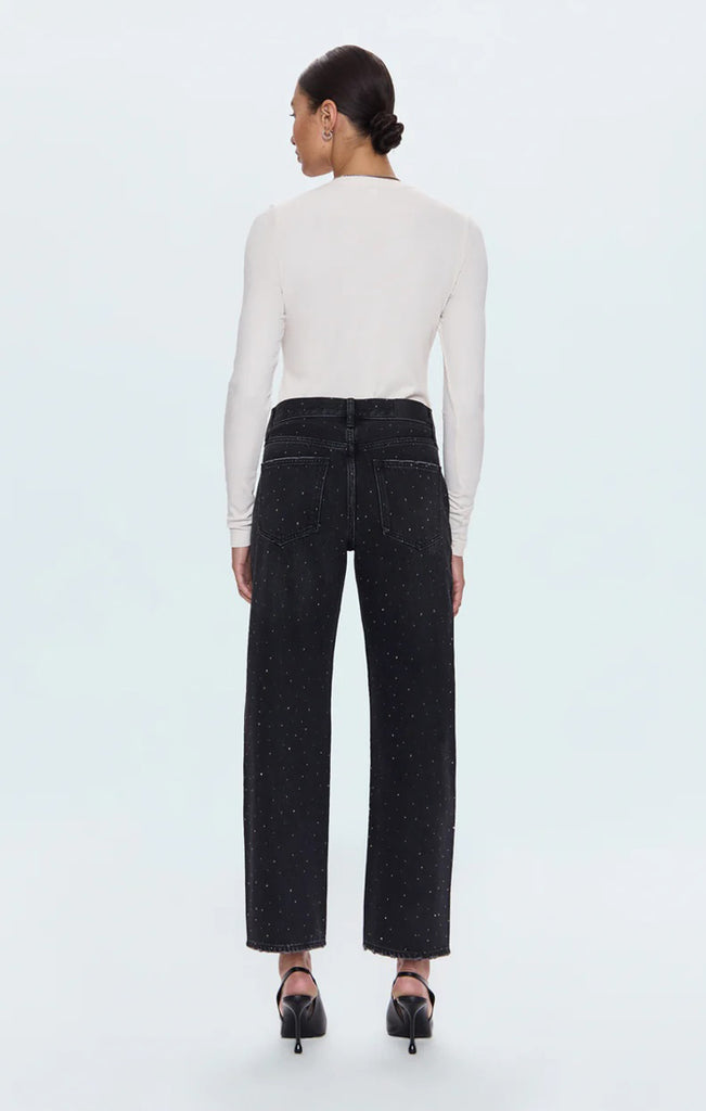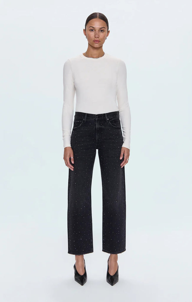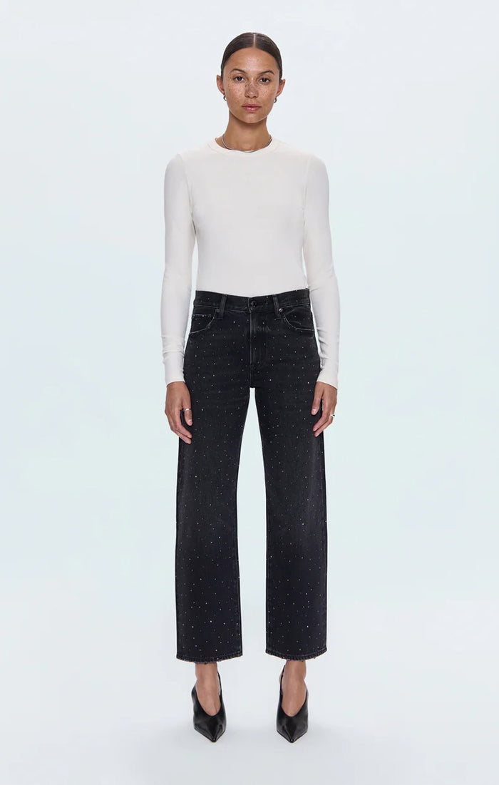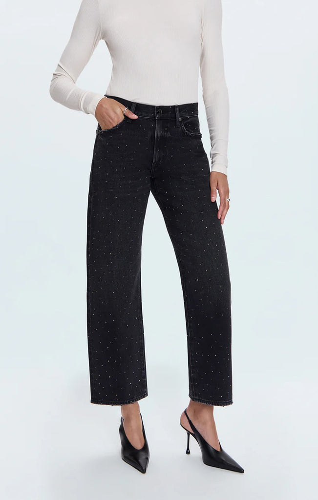 - A best-selling silhouette, Lexi features a mid-rise and signature bowed straight leg with a subtle curve through the knee for dimension and ease. The 29" inseam tapers to a clean, cropped ankle. Crafted from rigid denim in Silver Screen, a black wash adorned with micro rhinestones that catch the light for understated shimmer.