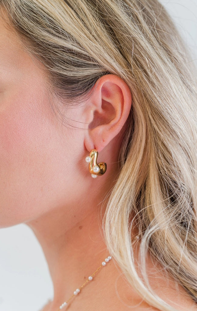 - Bold yet elegant, these earrings feature a sculptural gold hoop accented with lustrous freshwater pearls for a modern twist on a timeless classic. Their unique design makes them the perfect statement piece to elevate both everyday looks and special occasions.