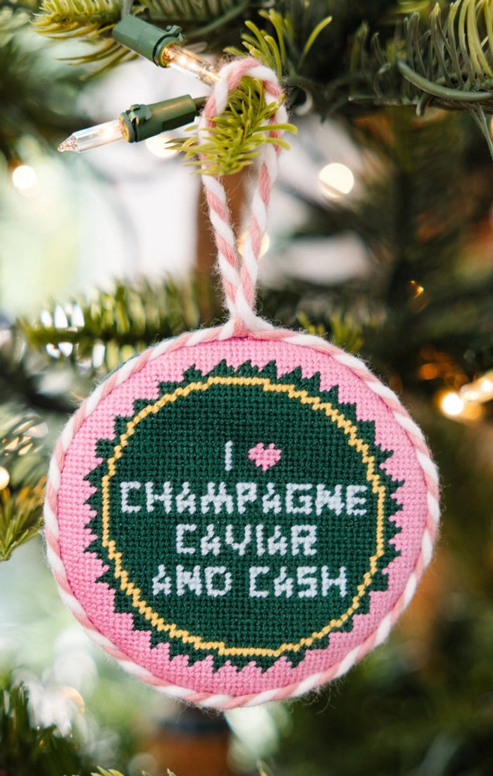- For the one whose holiday spirit comes with a side of luxury. Hand-stitched and velvet-backed, this playful piece proves that taste—and humor—never go out of style. A little boujee, a little bold, and totally tree-worthy.