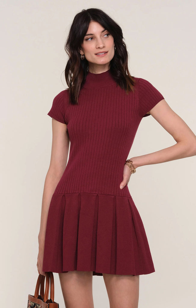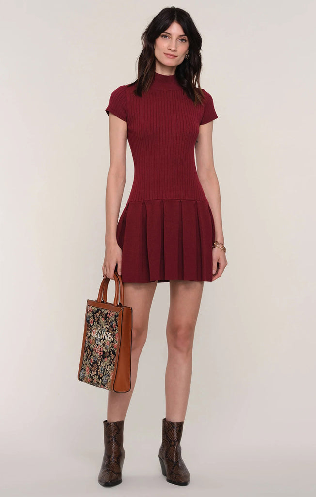 The Polina Dress is a slim fit, knit dress. It features a mock neck, cap sleeves and a pleated skirt. We love it worn with ballet flats and an oversized jacket.