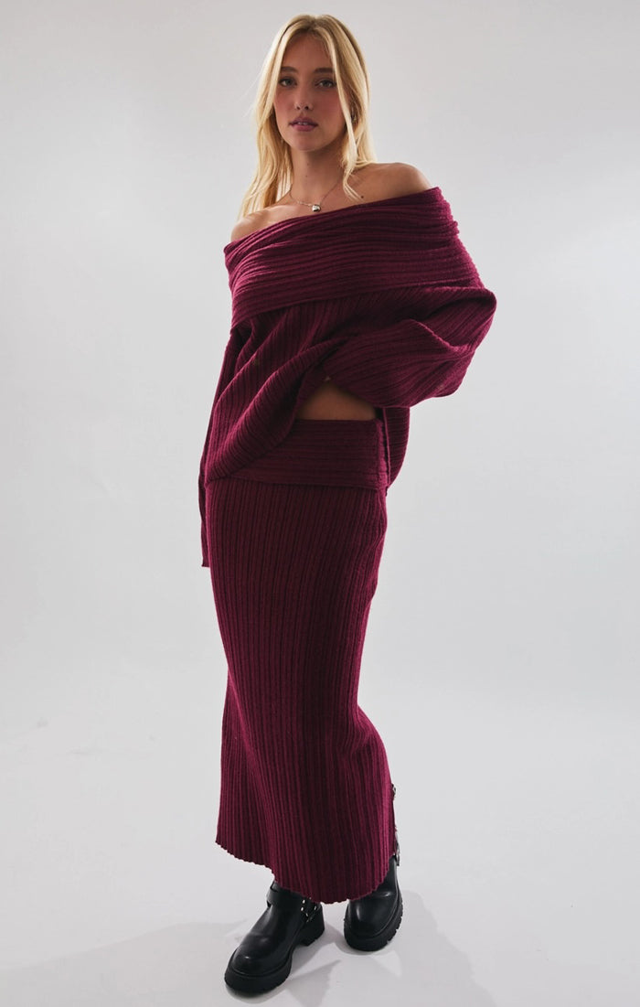 - Meet your new fall obsession. This ribbed knit set from Le Lis brings effortless cool to cozy season with its slouchy off-the-shoulder neckline and curve-skimming maxi skirt. It’s equal parts lounge and luxe — the kind of outfit that looks like you tried (but didn’t). Pair it with chunky boots or your favorite sneaks and consider your “what to wear” dilemma officially solved.