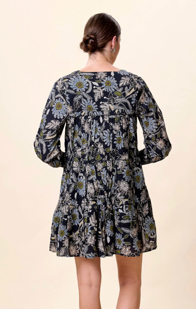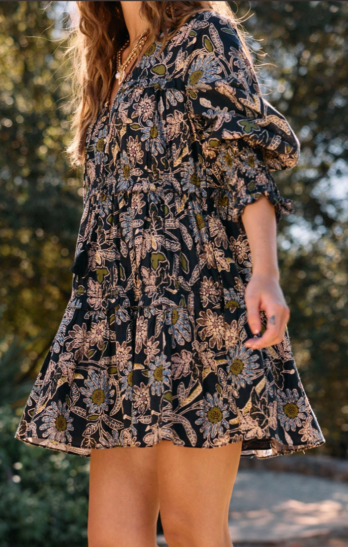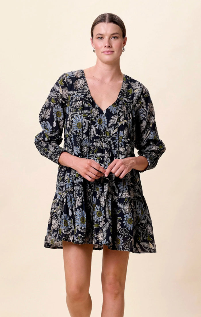 - Ethically handmade in India from 100% GOTS-certified organic cotton mulmul, the Raquel Mini Dress is a timeless wardrobe staple that combines sustainability with effortless style. This feminine mini dress features delicate baby ruffle tiers, a shirred silhouette, and smocked cuffs for a flattering, comfortable fit. Finished with a tassel-tie neckline, it’s the perfect piece to wear from day to night—pair it with sandals for a casual look or dress it up with boots and accessories.