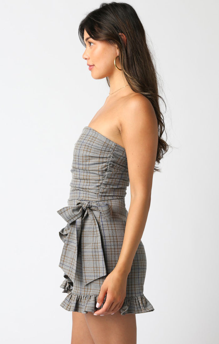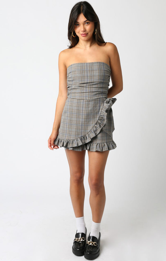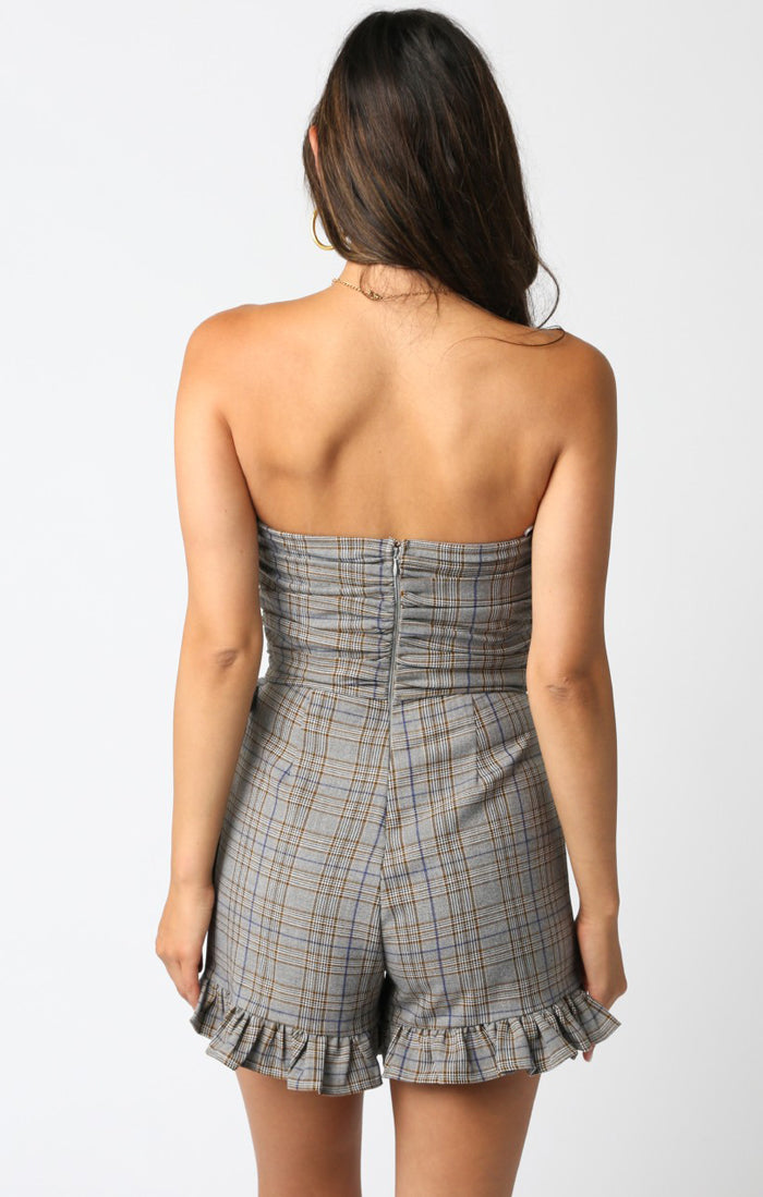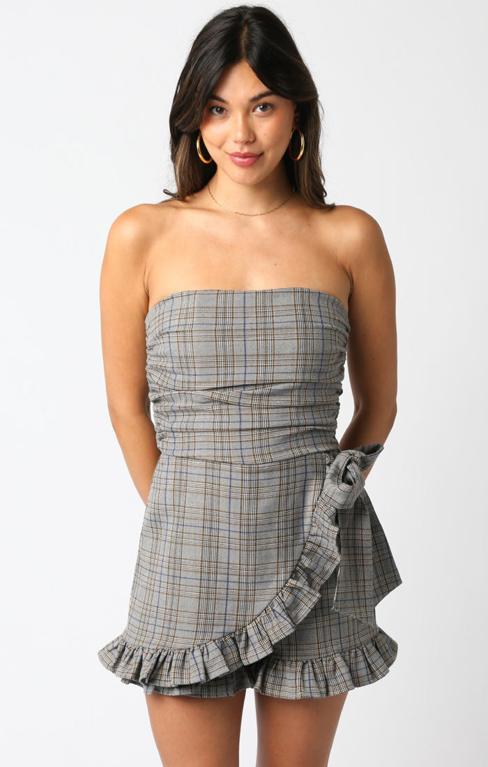 Sweet, but make it a little sassy. The Skye Ruffled Romper serves major charm with its flirty wrap detail, subtle plaid, and ruffled trim made for movement. Strapless and effortlessly cool—this one’s here for coffee dates, rooftop nights, and everything in between.