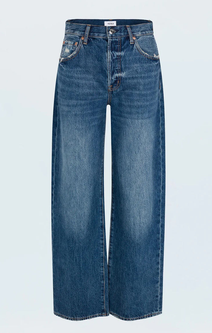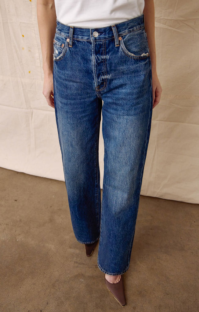 - Blue denim, finally done right. Tate delivers the cool girl piece you've been waiting for—a modern denim fit that redefines effortless style. Sitting at a high rise with our signature bowed wide leg silhouette and full-length 32" inseam, this new fit brings trouser sophistication to the classic five-pocket jean. The subtle curve through the leg adds dimension while the wide opening brings modern proportion to any look. Crafted from 100% cotton non-stretch denim in Fulton, a classic blue wash that feels both timeless and contemporary.