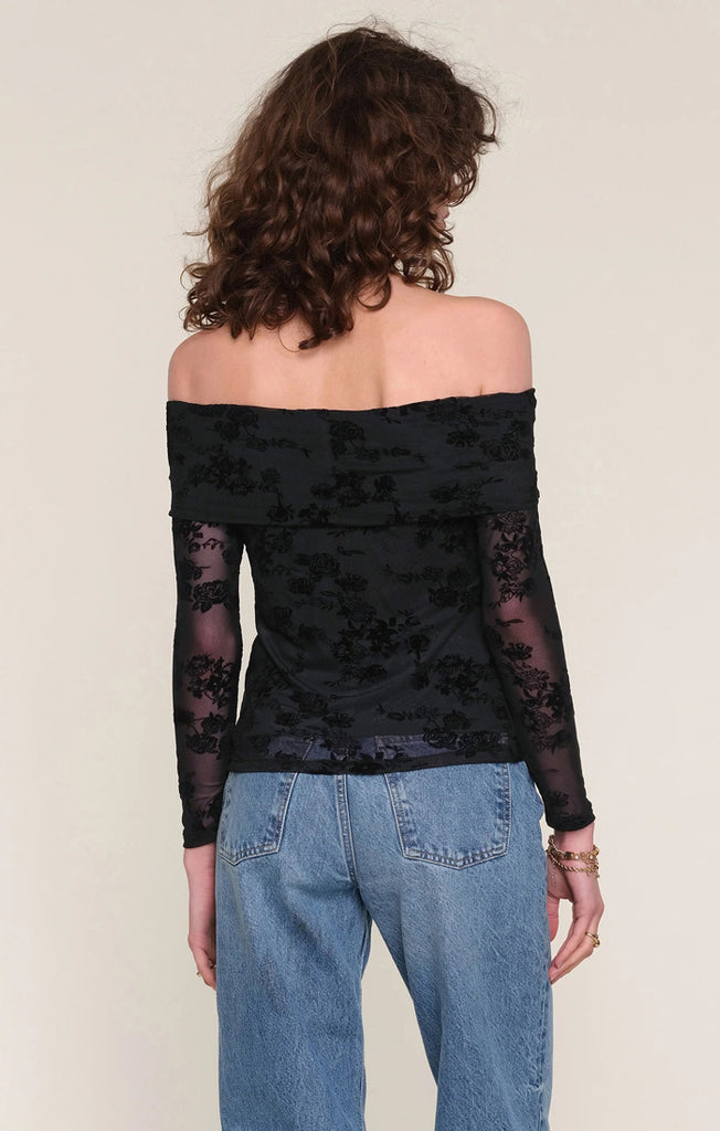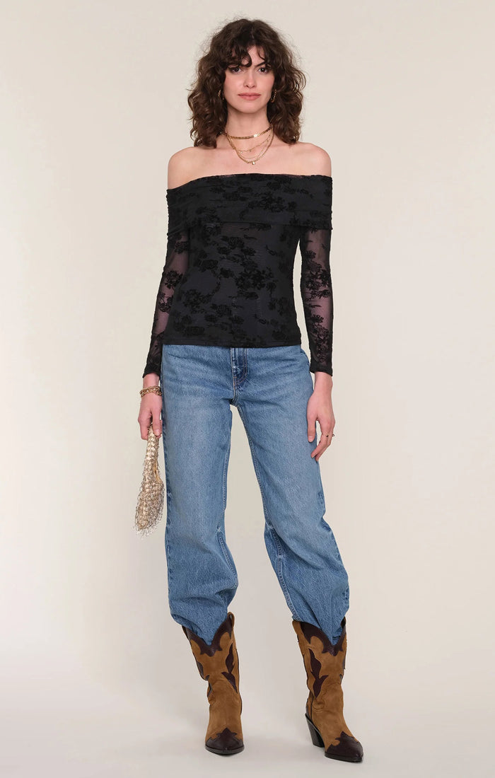The Tatum Top is made from a burnout mesh. It's a slim fit, off the shoulder top with long sleeves. We love it simply paired with your favorite denim.